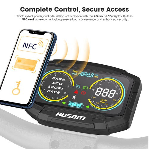 The 4.5-inch LCD screen displays speed, battery level, and riding mode clearly at a glance. Adjustable handlebars and seat height accommodate riders from 140 to 200 cm (4'8"-6'7"). With a one-click folding mechanism and a max load of 130 kg (287 lbs), it’s designed for both comfort and portability.