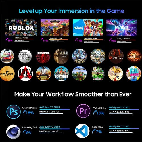 With its gaming-grade AMD Ryzen 7 5700U, Blackview MP100 achieves a max turbo frequency of 4.3GHz, making it ideal for a wide range of everyday uses, work situations, and gaming, ensuring top-notch performance and immersive experiences.