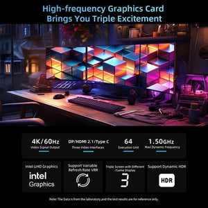 B10 Pro mini computer features Intel UHD graphics with a dynamic frequency of up to 1.50GHz. It can not only smoothly play 4K videos but also run various mainstream games stably at high frame rates. Furthermore, it supports simultaneous connection of three monitors, making your life more exciting.