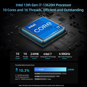 B10 Pro mini pc boasts a powerful heart. It's equipped with an Intel Core i7-13620H processor, featuring 10 cores, 16 threads, and a turbo boost up to 4.90GHz. With its robust multitasking and computing capabilities, it can easily handle various office tasks.