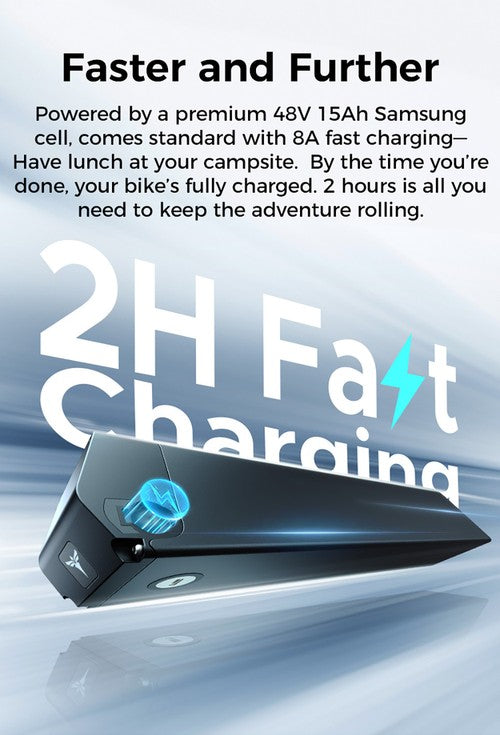 Powered by a premium 48V 15Ah Samsung cell, comes standard with 8A fast charging. 130km of range lets you explore winding forest paths, cross rocky ground, and still cruise back before sunset.