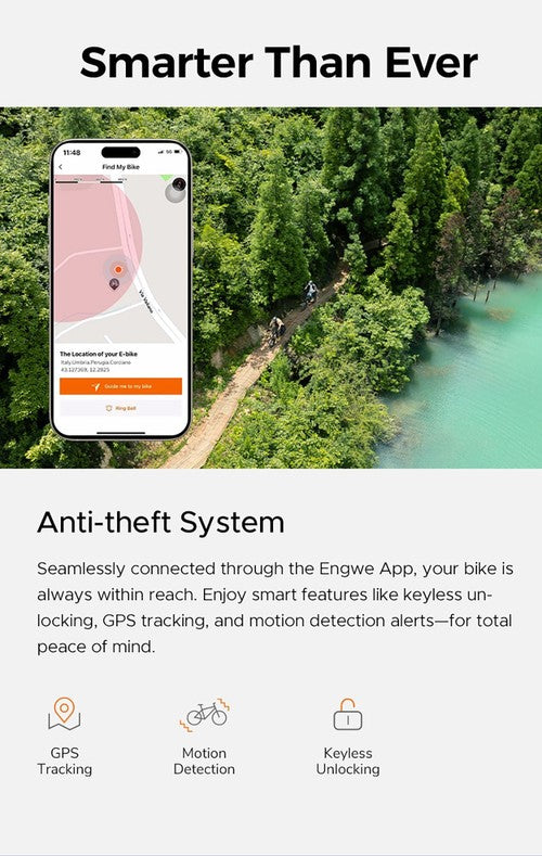 Seamlessly connected through the Engwe App, your bike is always within reach. Enjoy smart features like keyless unlocking, GPS tracking, and motion detection alerts—for total peace of mind.