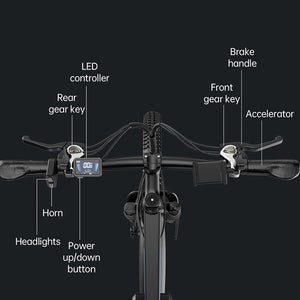 | Specification | Motor: 1000W Battery: 48V 21Ah Tire: 29*2.1 inch Max Speed: 25km/h, 48km/h (after unlocking) Range: 70-90km (PAS mode) Brake: Mechanical disc brakes Shock Absorber: Front fork shock absorber Transmission: Shimano 21-speed Climbing Slope: 30° Max Load: 150kg Display: LCD Light: Headlight, taillight Charging Time: 5-7h |