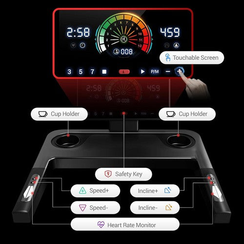 This foldable treadmill is equipped with heart rate monitoring sensors and quick control buttons on the handrails. During exercise, simply touch the sensors on the handrails, and your data syncs to the LED display in real time. Speed adjustment, start, and stop controls are at your fingertips on the left and right handrails, allowing you to operate without diverting your attention to the screen. This convenient design maintains your exercise rhythm, ensuring a safer, more efficient, and smoother workout.