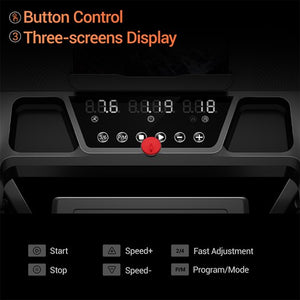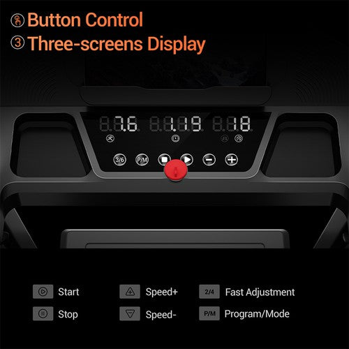 This portable treadmill is ready to use right out of the box, with no assembly required. It supports three distinct workout modes: Walking (1–3 km/h), Jogging (3–6 km/h), and Running (6–12 km/h), all controlled via an intuitive button panel with a triple-screens display. The 135° adjustable tablet holder lets you stream workouts or entertainment, while the 97×40 cm (38×16 in) running belt provides ample space for comfortable strides.