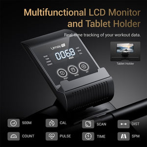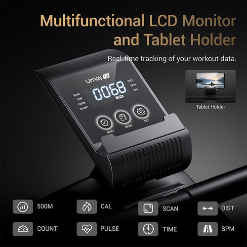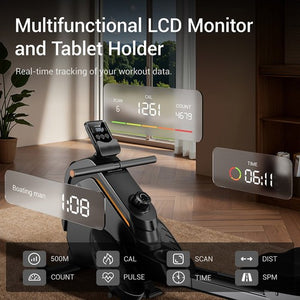 The rowing machine is equipped with an LCD display that shows time, movement, distance and calories burned in real time. Thanks to the tablet support, you can watch videos or follow the training programme for a better training experience.